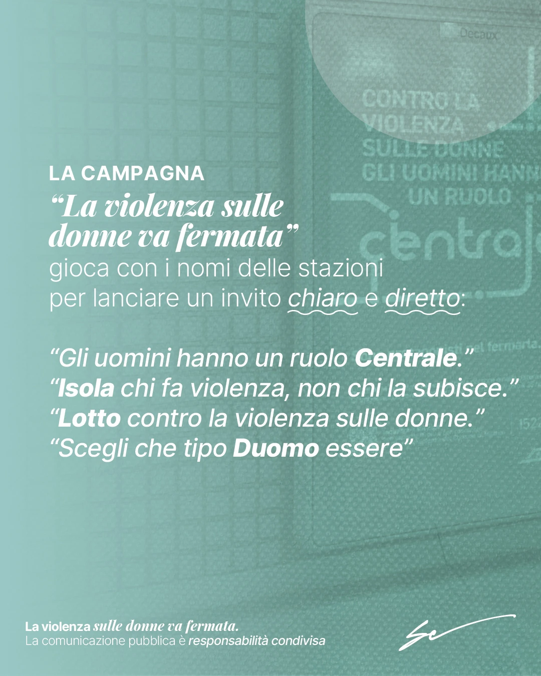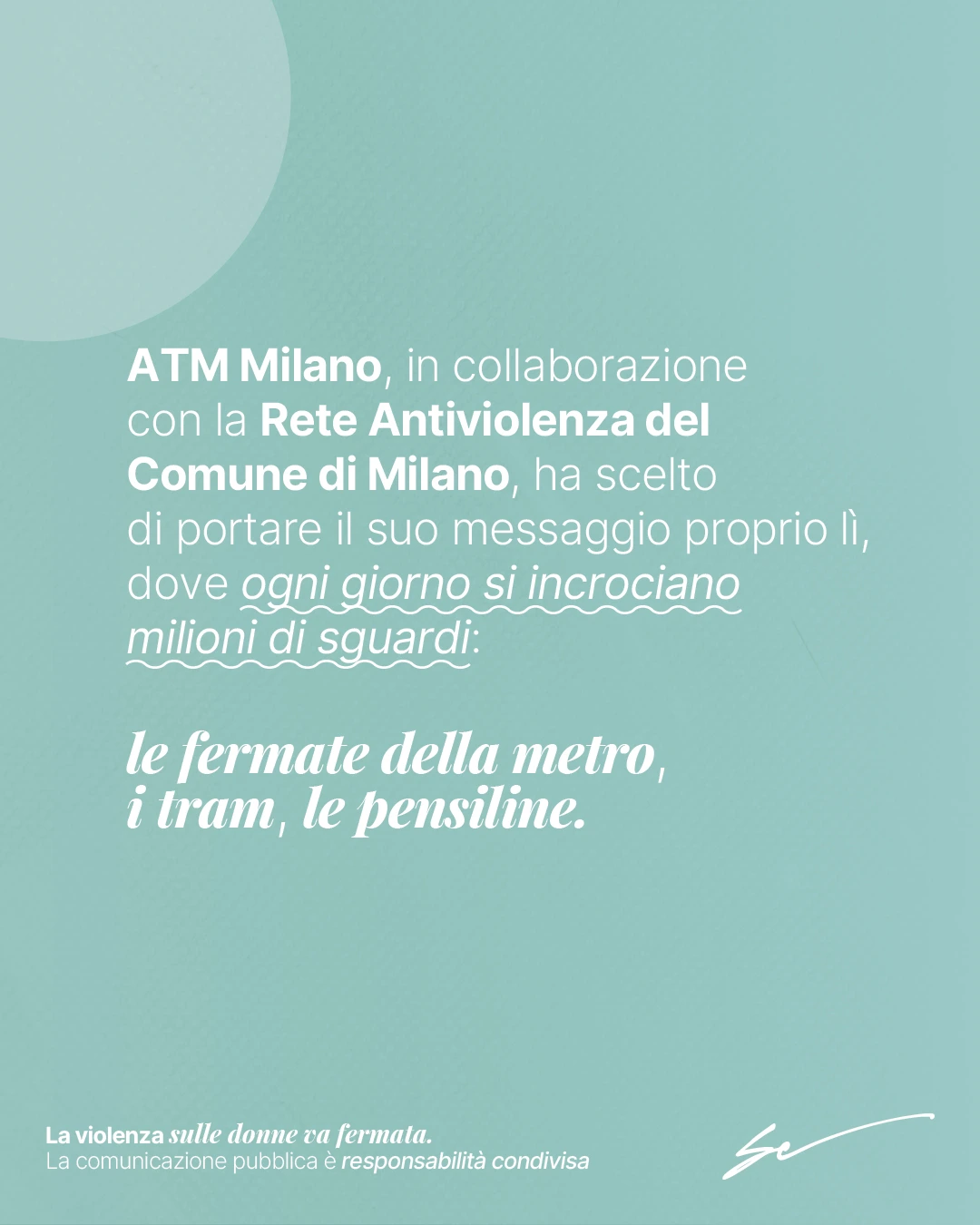 È esattamente ciò che ha fatto ATM – Azienda Trasporti Milanesi, con la campagna “La violenza sulle donne va fermata”, realizzata in collaborazione con la Rete Antiviolenza del Comune di Milano e ideata da YAM112003.