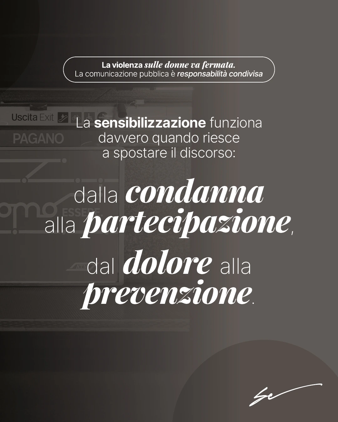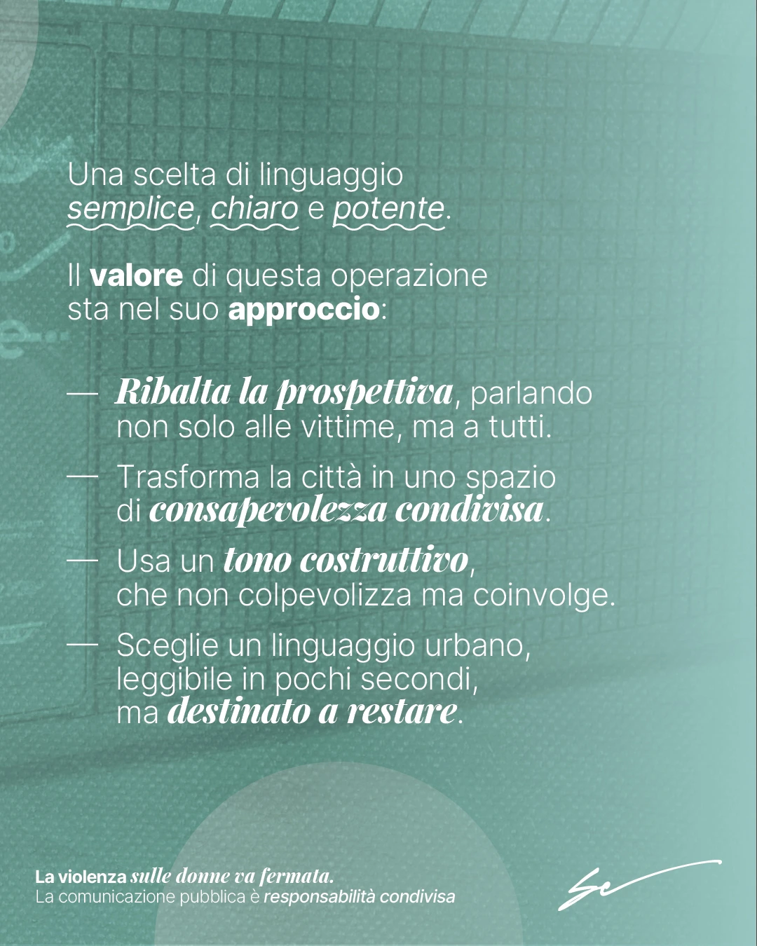 Il messaggio non si rivolge solo alle donne vittime di violenza, ma a tutti. E soprattutto agli uomini, chiamati non come “colpevoli potenziali” ma come parte attiva nella prevenzione. - Rendere la città un luogo di consapevolezza